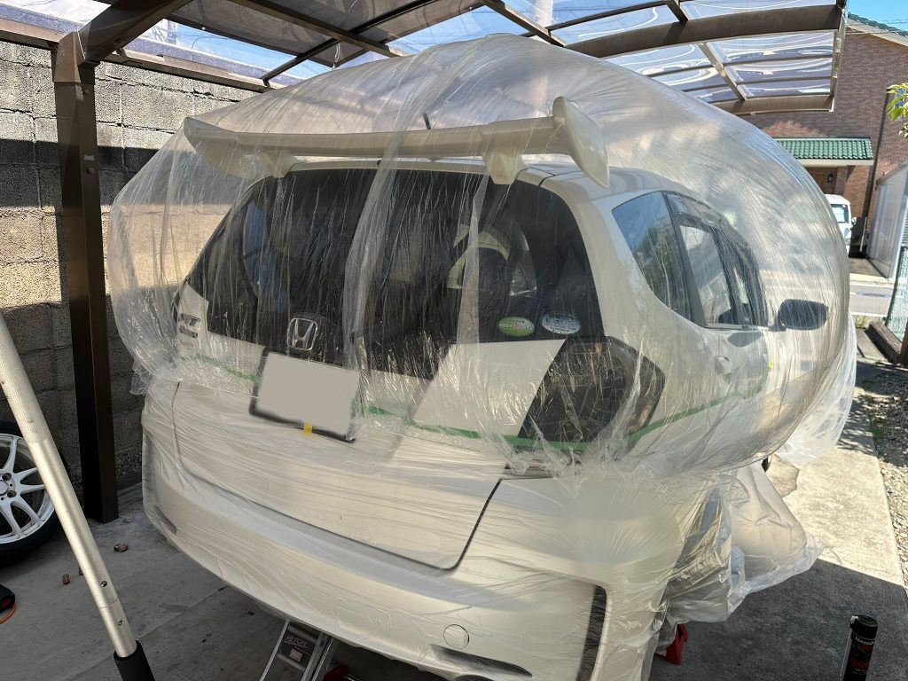 次に養生します。画像は途中ですが、カバーみたいなマスキング楽かなと思って導入しましたが、空気も入ってしまってイマイチでした。やはり通常のマスキングの方が使い勝手いいですね。新しい物を導入するってなかなかコストも掛かりますし、思い切りも必要なので安い物ならとりあえずテストってことで導入し易いですが、高い物はちょっと・・・