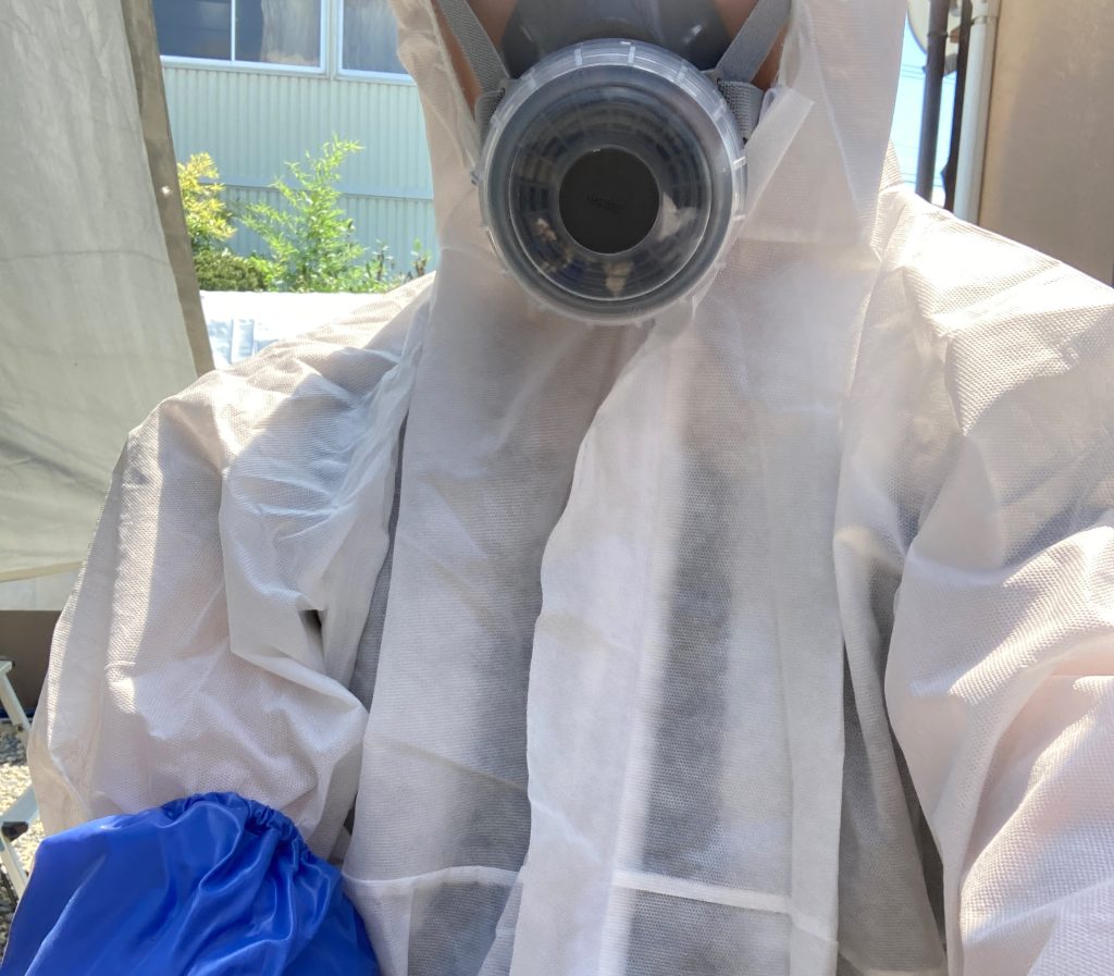 使い捨てツナギに防護マスクと保護メガネに長手袋でバッチリです。以前普通のマスクでやってたら、顔も真っ黒でコンタクトまで黒くなって大変でした。暑くても保護具は大事ですね。
