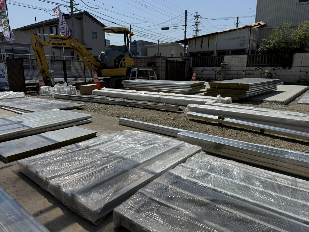 画像は到着した材料になります。敷地内がいっぱいになりました。