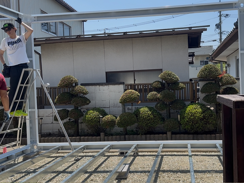 柱が終わったら、屋根の方のフレームを取り付けます。このときは脚立2台と人が3人は必要です。