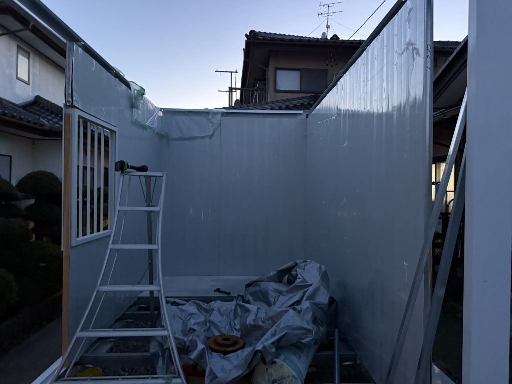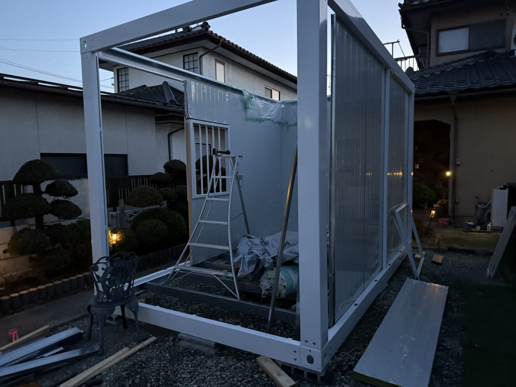 午後からはプレハブ小屋建設の続きを行いました。先日はフレームと柱が終わり、その後忙しく放置していたので、やっと時間が出来たので壁を取り付けることにしました。