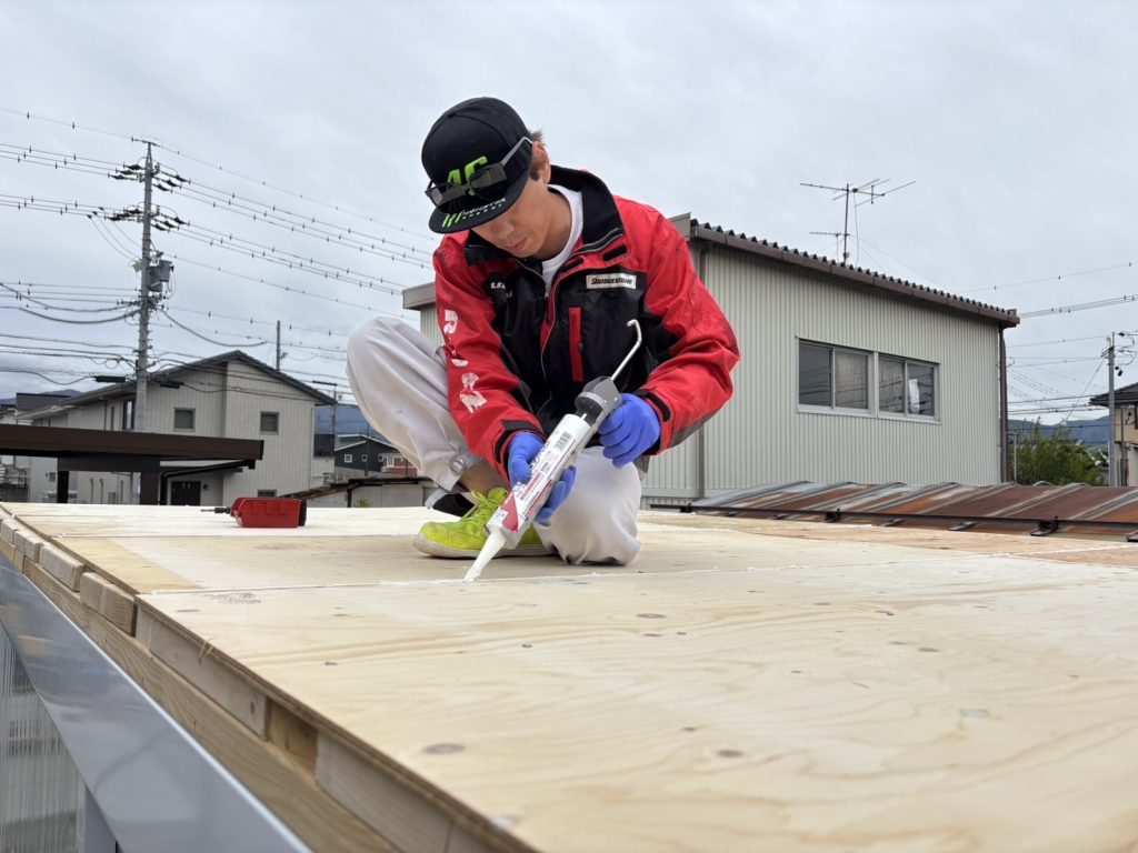 繋ぎ目はコーキングを行いました。雨漏りだけはしたくないのでしっかりとやっておきます。