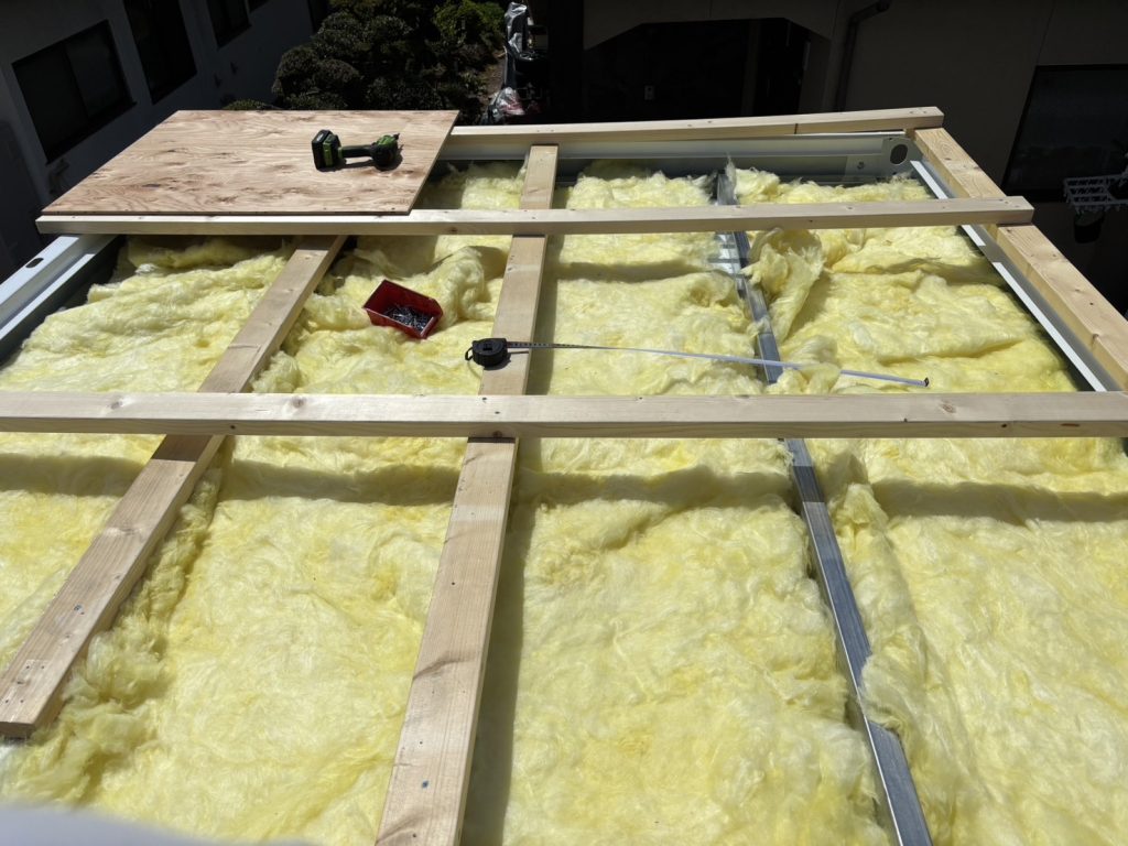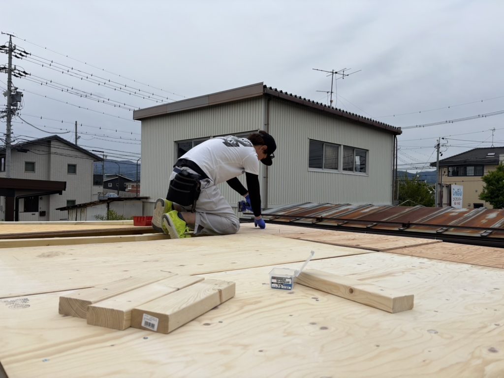 合板を上から貼ります。めちゃくちゃしっかりしたので屋根のどこでも歩けるようになりました。