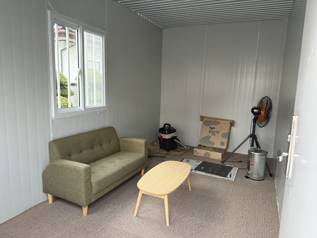 一気に事務所っぽくなりましたね。これでお客様にお待ちいただくことができますね。あとは私のPCデスクとエアコンに電気を通せば完成します。本当に楽しみですね。