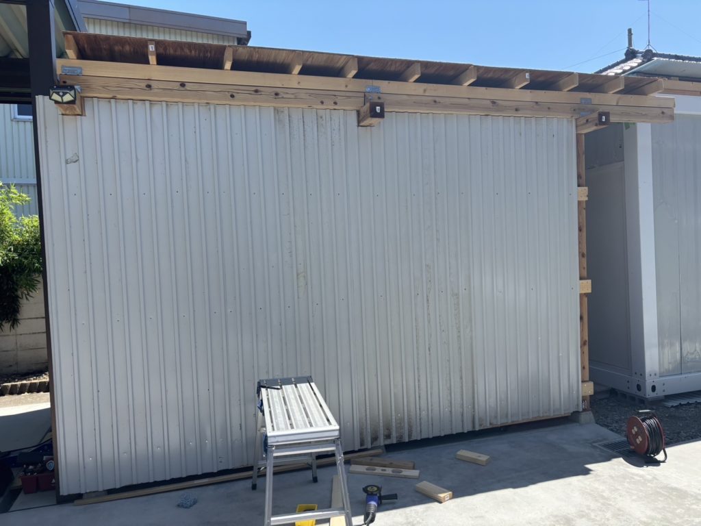 ちなみにこちらの材料はプレハブ小屋の屋根材です。反対側は木製小屋の屋根に使っていたポリカを再利用しております。