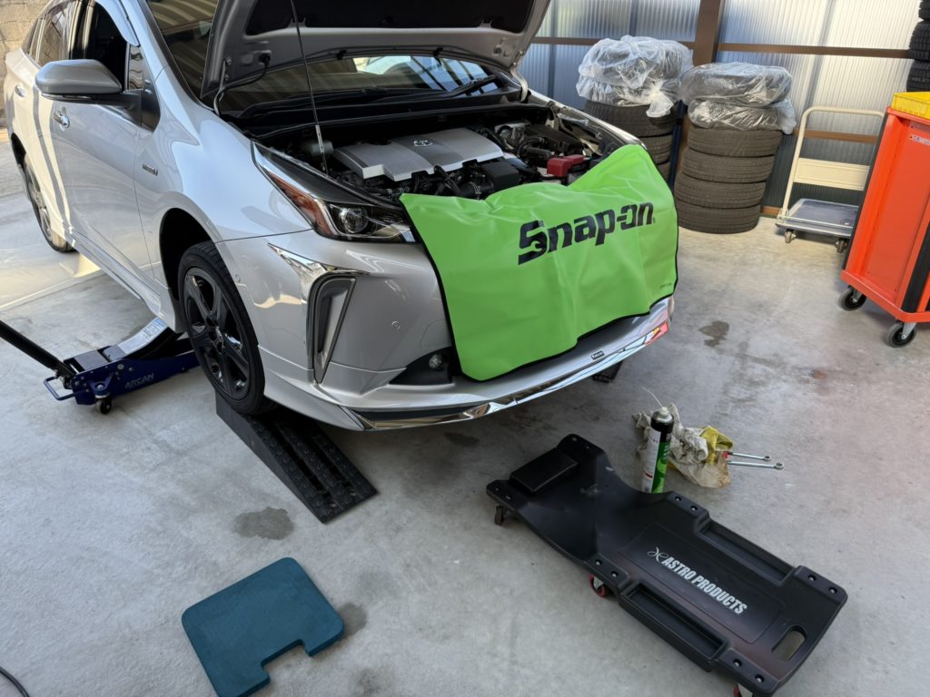 プリウスのオイル交換 2025.08.19 オイル交換 本日はプリウスのオイル交換を行いました。 ご購入されたばかりとのことでオイル交換のご用命いただき、ありがとうございます。 オイルは当店指定の化学合成油を使用させていただきました。 お気に入りのスナップオン製カバーを使用しております。 エアロ装着車のため、スロープは使えないためジャッキで上手く上げてスロープで安全確保してあります。 やはりリフトが欲しいですね。あれば便利です。本当に。 交換終了です。 ステッカーを貼っておきました。 ありがとうございました。 アクアにコーティング 前の記事 下取り車両の仕上げ 次の記事