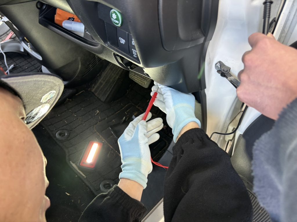久しぶりの軽自動車のため配線がたくさん余ります。ワゴンだと取り回し悪いと短くなってしまうときがありますね。